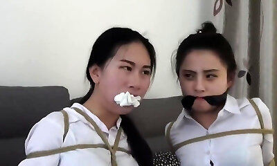 Chinese secretaries in white shirts are thoroughly gagged