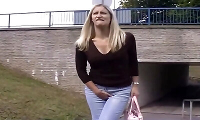 Pale busty blondie pisses and then deep-throats a dick on the river bank